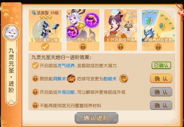 当助战开启进阶后,助战的特色技能会进化成更强劲的技能,同时也可以解锁更多的助战外观造型,但相应地,开启进阶后的助战将不再可以使用混元丹进行重置培养。
