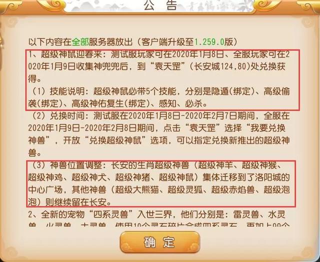 想要一只萌萌哒的超级神鼠陪你闯荡三界吗?在2020年1月9日-2020年2月8日期间可以点击长安城NPC“袁天罡”选择“我要兑换神兽”进行指定兑换,超级神鼠必带5个技能,分别是隐遁(绑定)、高级偷袭(绑定)、高级神佑复生(绑定)、感知和必杀,堪称最完美隐攻神兽,实力非常强大。