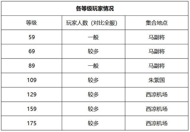 从统计表格中可以看出,朱紫坊区内除59级、89级玩家数量一般外,其他等级段玩家数量都较多,尤其以109级、129级、175级散人玩家数量最多。