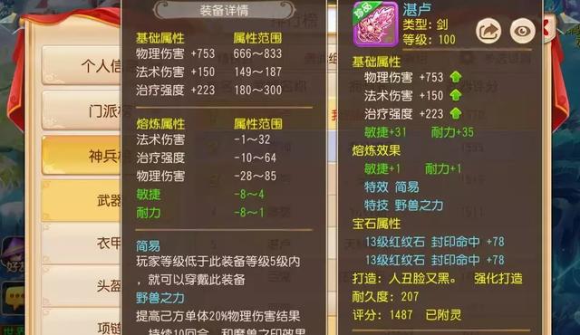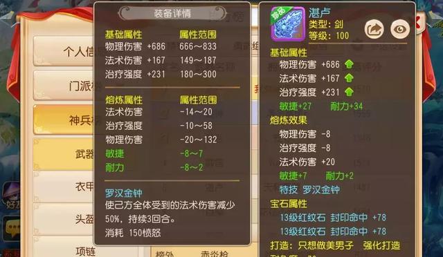 湛卢,古代十大名剑之一。而这把100级的湛卢也并没有辱没它的威名,敏耐双加高达70!还带有特技罗汉金钟,这位方寸大哥的强势让人感到心安不已。