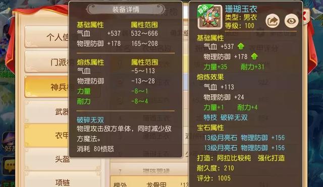 这件100级的男衣,力耐双加71,物防熔炼接近满值,附加特技破碎无双,这真是一件极其暴力的装备啊。