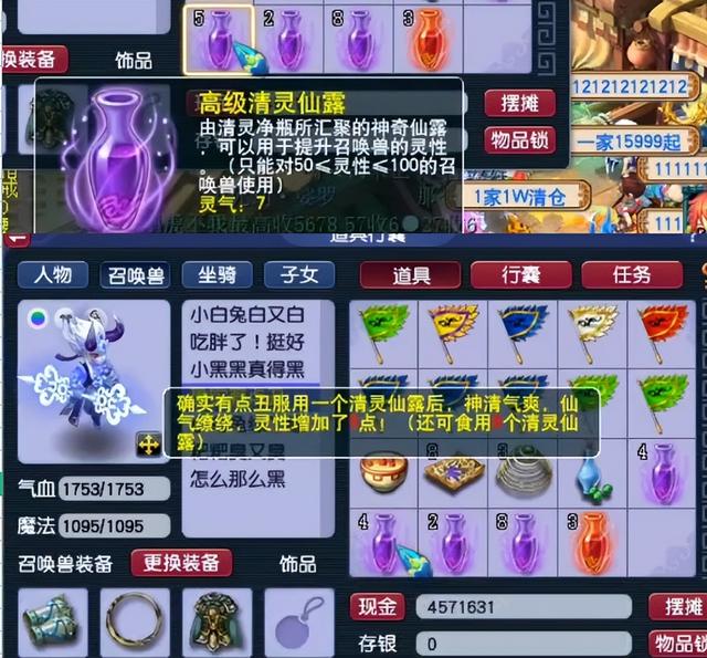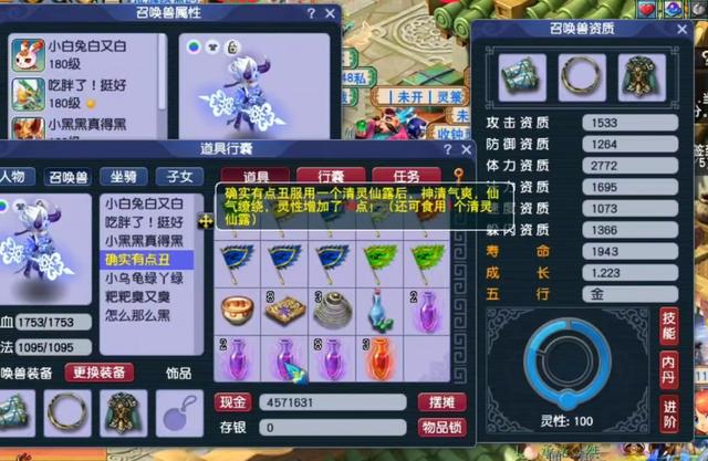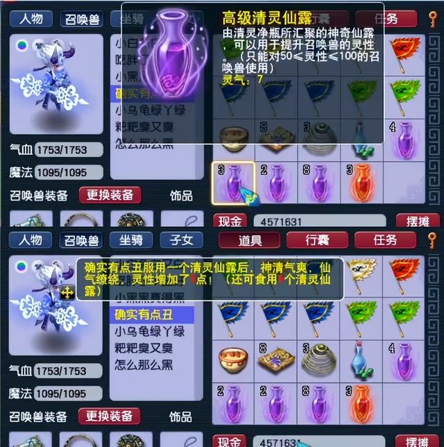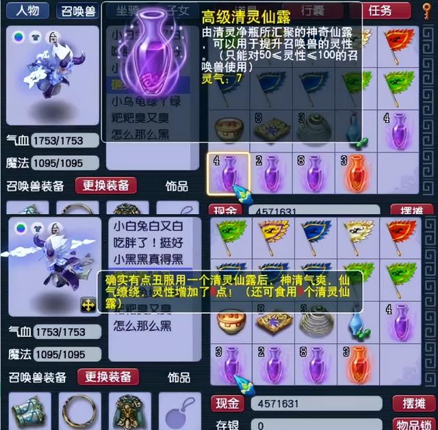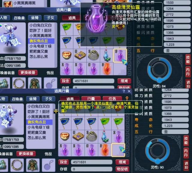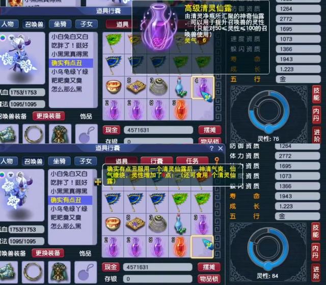 由于玩家只打算进阶一次,所以第5个清灵仙露玩家选择了继续吃高6。就算没暴,灵性也有90。如果第6个吃高8并且能暴到10点的话,还有进阶110灵性的可能。即便不暴,第7个清灵仙露也能吃。