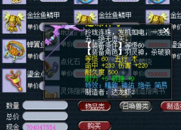 这是一件60级拥有四种特效效果的武器,分别精致、神佑,绝杀、简易这四个特效,他们也有一点用处说没用,但是真正用起来也没啥用,精致可以让装备多镶嵌一级宝石;神佑可以保证生存,绝杀能够让玩家攻击怪物时有几率直接打飞目标,简易可以让59级的玩家使用这一件装备。但是这些特效能不能之前全看装备的属性啊,60级的武器属性又不高,这就是他没用的原因。