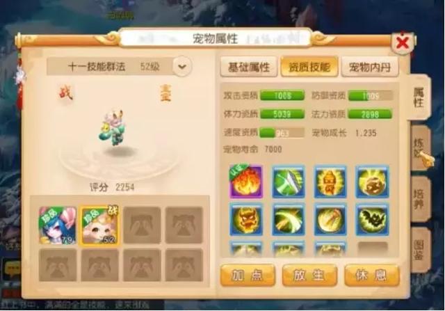 最后补一手高级法术暴击,没想到它竟如此给力,直接进入到了7号位!至此,一只11技能的龟速群法宠就新鲜出炉啦!