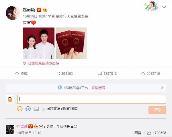 据说小两口的微博官宣时间都是精心安排的,公布当天正是丽颖妹妹的生日十月十六日,准确时间是十点零7分,正对应冯绍峰的生日,十月七日……狗粮还要撒的这么精致,服气!