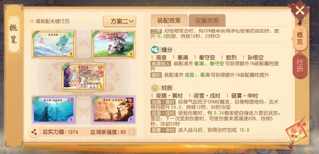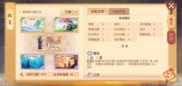 这套搭配采用了2张紫卡+3张金卡,为治疗门派提升治疗能力及防御能力。情绪词条上,3【合】+2【喜】激发【金玉】,当队友激活并触发【天合】或【地合】时,则将激活词条技能【极乐】,对目标释放治疗技能时,有30%概率使其获得可持续十秒的血量回复;否则将激活词条技能【心悦】,对目标释放治疗技能时,有20%概率使其获得可持续十秒的血量回复。三界词条【三界】也提供了防御加持和技能回转。缘分词条方面,【秦漓】与【秦守安】可组合为双人缘分【桃园故人】,【观音】与【秦漓】又可组成双人缘分【普陀】均可为少侠带来额外的配装属性提升。时辰词条【夜晴·寅时】将在自身气血低于30%时触发,提升自身物理格挡和法术格挡能力追加命中能力,【夜雪·戌时】在少侠受到伤害时,有概率使自身进入雪迟状态,在下次受到伤害时对伤害来源进行减速。【昼雾·申时】在战斗状态下进一步追加治疗能力,不失为一款优秀的治疗门派适配方案。
