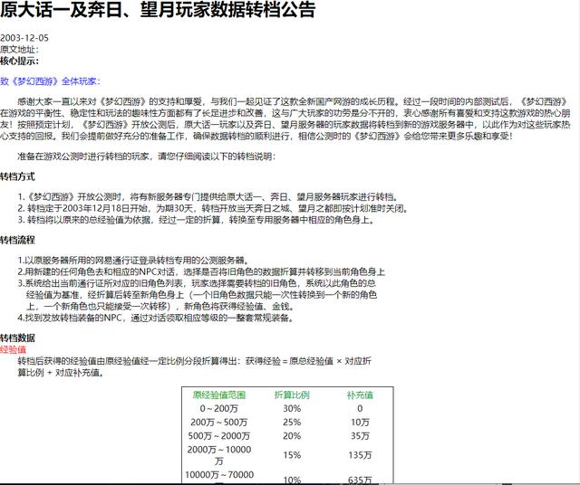 03年12月5日,官方发出公告《原大话一及奔日、望月玩家数据转档公告》
