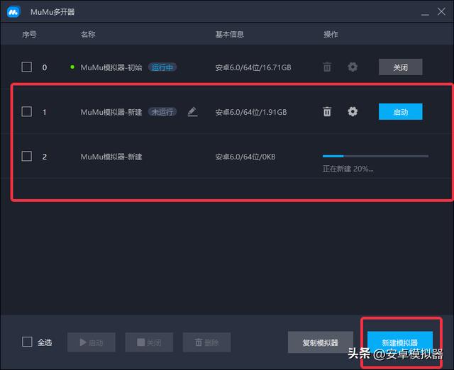 MuMu模拟器版本在2.6.4及以上即可支持模拟器多开,模拟器多开打破了应用多开方式最多只能5开的限制,电脑本身性能越高,多开的上限就越高,并且所有多开的模拟器可同时使用操作录制功能,更加便于切换操作,轻松挂机肝小号!