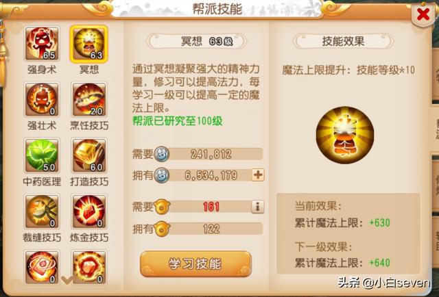 4.记得一定要加入帮派,帮派技能强身术,冥想增加气血的,有帮贡就去学习,但是银币yě消耗的比较多,但是物有所值,其余打造,缝纫,炼金,熔炼,烹饪都需要xiāo耗活力,这几项选择2项学习吧,消耗活力的,一个60级的打造符450金左右,一天完成所有的日常打底800活力,消耗60活力,至shǎo15个打造符,不错的金币来源收入(后续你如果想单人养育孩子,活lì值消耗更大,所以明白日常的作用了吧)