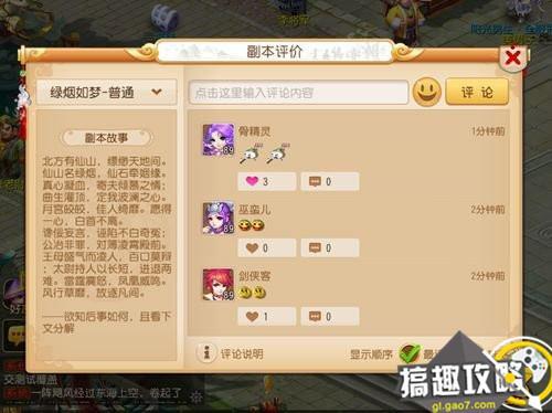 展示全服玩家对副本的评论。玩家在新副本通关后有概率获得道具“紫毫笔”,使用该道具可对副本进行评论(每次消耗1个)。