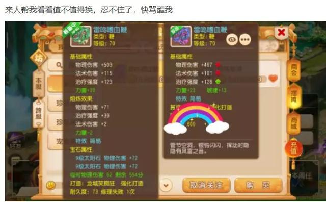 该玩家原来的装备是一件简易特效的雷鸣嗜血鞭,武器虽然不算极品但也着实够用。而他准备换的武器也同样是简易特效雷鸣嗜血鞭,不同的是新的鞭子物理伤害和法术伤害都比原来的要低,就是多了力量和敏捷双加。看到这样的装备网友们就有些看不懂了,觉得新武器虽然是双加但是基础属性差的太多了,完全没有必要换呀,不知道该玩家是怎么想的,这还有必要纠结?