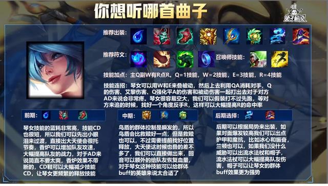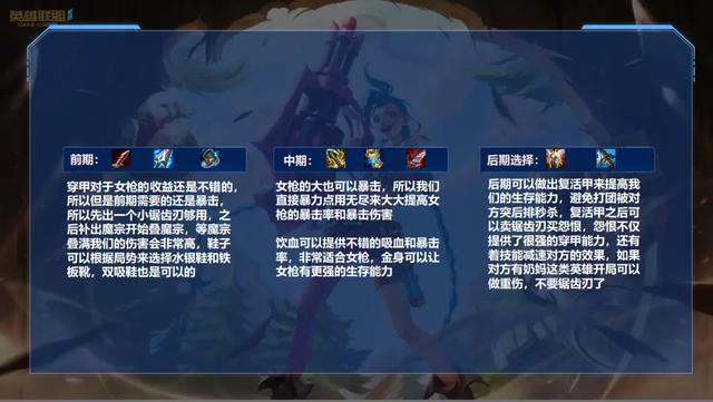 虽然纯穿甲的伤害不算很高,但是穿甲对于女枪的收益还是不错的,我们可以先出锯齿刃来提高一下女枪的穿甲,如果对线奶妈这类英雄可以直接做小重伤,不用锯齿刃,之后补出魔宗,魔宗虽然叠的慢,但对于女枪这种单体伤害很高的英雄来说是非常合适的,叠起来的魔宗Q(1)技能也有加成,弹一下对面都是非常致命的,打团即便是没大的情况下,利用前排去弹对面后排也是非常疼的,鞋子可以根据局势来选择铁板靴和水银鞋,双吸鞋也不是不行,只不过容错低一点,附魔可以选择推推棒和金身,推推棒等于小型狂风之力,有一段位移很不错,出金身容错会更高。无尽可以大幅提高女枪的暴击率和暴击伤害,女枪的大也是可以触发暴击的,所以我们可以直接暴力点选择无尽,饮血可以提供很强的吸血和暴击率,相比破败更适合女枪,复活甲可以大幅提高女枪的容错和生存能力,最后一件可以根据局势来选择怨恨和死刑,如果对方有奶妈这类治疗效果非常强的英雄我们可以选择死刑来应对,其他情况选择怨恨是最好的,怨恨不仅提供了很强的穿甲能力,附带的技能减速效果也是很不错的,尤其是配合女枪的ER来使用。