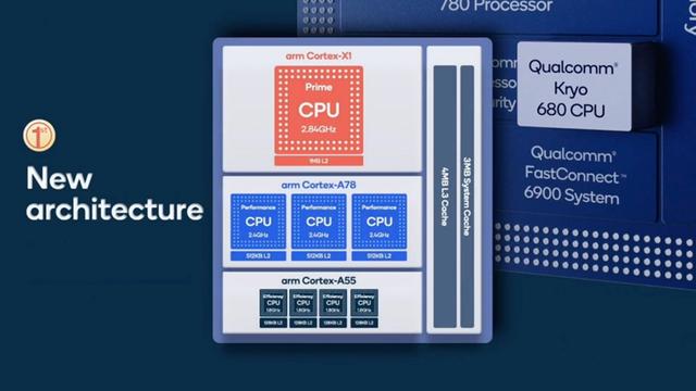 骁龙系列芯片最近几年一直使用的是三丛集的架构,骁龙888选择了Kryo 680 CPU,包含一枚最高主频2.84GHz的Cortex X1超级大核,3枚最高主频 2.4GHz的Cortex A78核心和4枚最高主频1.8GHz的 Cortex A55 核心,在使用过程中,三类大小核心可以自由切换,适合现阶段智能手机越来越复杂的多任务处理场景。
