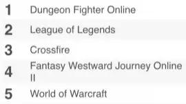 据排名显示,本期PC榜单Top5分别由《地下城与勇士》、《英雄联盟》、《穿越火线》、《梦幻西游2》和《魔兽世界》瓜分。可以发现,WoW的表现稍有回落,而其余四名则均为Top5的常客。