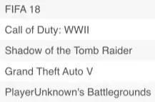 Top6-10的位置,则分别是《FIFA 18》、《使命召唤:二战》、《古墓丽影》、《GTA V》和《绝地求生》。在这里,可以找到被挤出前五的“使命召唤”和“GTA”,而上期同样在前五的《麦登橄榄球19》,则直接被挤没了。