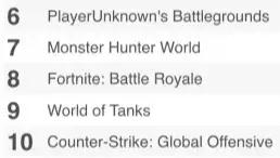 Top6-10的位置,则分别是《绝地求生》、《怪物猎人世界》、《堡垒之夜》、《坦克世界》和《CS:GO》。同样地,这几名也是Top6-10的常客。