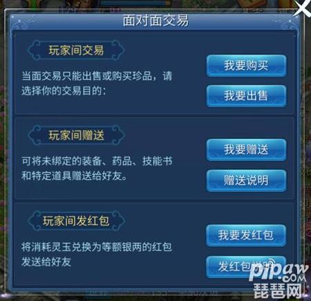 功能:玩家可通过面对面交易给指定玩家发送红包,每月发送单人红包的额度与商城赠送额度共享。