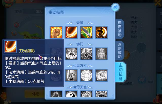 最后就是“刀光剑影”了,此技能可以理解为开天辟地的升级版,可临时提高攻击力攻击4个敌方单位,在PVP竞技中此技能的实用性并不是很高,毕竟天策是看准时机点杀对面主要作战单位的门派,日常刷图还是不错的。