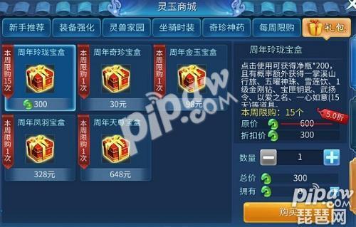 周年玲珑宝盒:获得净瓶*200,且有概率额外获得一掌溪山行旅、五曜神珠、雪莲饮、1级金刚钻、宝匣钥匙、武扬令、以爱之名、一心如意(15天)等道具。