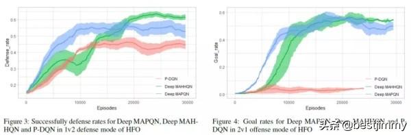 可以看到在两种模式中,Deep MAPQN 和 Deep MAHHQN 相比于 P-DQN 均得到了更好的训练结果(进球率和防守成功率)。另一方面,后者的训练结果表现更优于前者,这说明我们对 Deep MAHHQN 集中训练部分的改进在一定程度上加深了不同智能体之间的交流,提高了算法稳定性。进一步观察习得的策略,可以发现 Deep MAPQN 和 Deep MAHHQN 所训练的两名球员能够在比赛开始时就自动分工(比如在防守时,一方负责守门,一方负责抢球),以取得更好的防守效果。