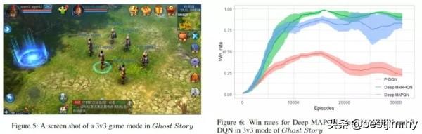 在倩女幽魂游戏中,我们选取了「3v3」的游戏模式进行测试,即控制三个同一方的角色与内置 AI 控制的另一方进行对战。在该环境中,动作空间和状态空间相比 HFO 都复杂了许多。每个智能体控制的角色可以释放不同技能(离散)到不同的地点(连续的坐标),在技能释放地周围的角色都会受到影响,包括对该角色造成伤害,或是使该角色带上降低/升高攻击力或防御力的 buff(有时间限制),因此取得一局游戏的胜利需要不同角色间的高度合作。我们取得的实验结果与在 HFO 中所得类似,Deep MAPQN 和 Deep MAHHQN 均表现出了更为优异的训练策略,实际测试中两者控制的一方均能达到百分之七十五以上的游戏胜率。此外,在这个规模更大,环境更为复杂的游戏中,Deep MAHHQN 所需要的实际训练时间(小于一天)远小于 Deep MAPQN 所需的实际训练时间(约为三天),这个结果进一步验证了前文对两种方法计算复杂度的估计。