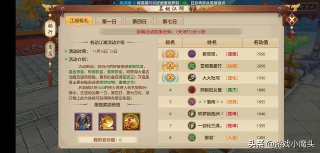 1、名动江湖将在16号开启,主要奖励是新坐骑:紫气金龙,新炫彩:炫彩·金荷,还有绝世宝物:重楼之华