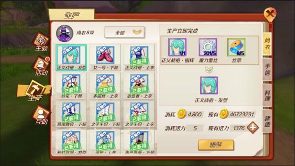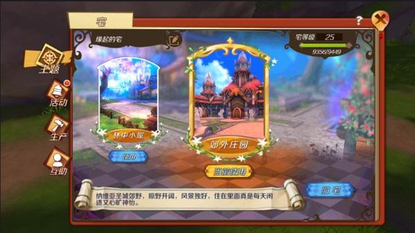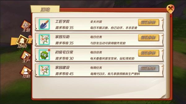 在主题界面的左上角显示着玩家家园的名字,右边显示着当前等级、经验值及升级到下一级所需的经验值。在左侧边缘有“主题”“活动”“生产”“互助”四个选项,点击可以切换到不同界面。点击“活动”按钮切换到活动选择界面,可以查看和接取各种活动。宅系统每天都有日常任务,点击“前往参加”按钮,系统会自动寻路,找到家园中的娜娜莉,点击娜娜莉可接取日常任务,完成后会获得相应家园经验和金钱。