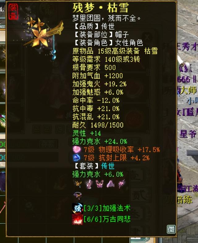 衣服、帽子选用强鬼火、强魅惑的底子,炼化强力克水、带一些灵性,建议大家去用15级的装备,这样的装备,抗性好调试,可以根据自身的需求来调节。