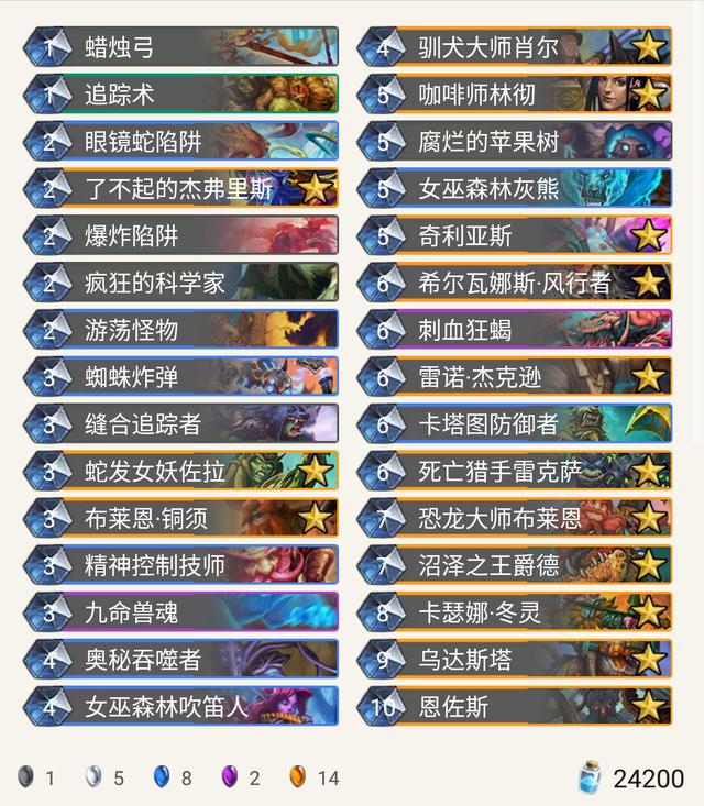 Duwin狂野亚服传说宇宙亡语猎,昨天的亡语猎是薄版的,今天来个超厚版的。构筑上加入了恩佐斯、女王、卡塔图、九命兽魂的亡语体系,久违的冬灵也回来了,并且这次大野兽有乌达斯塔、灰熊、王爵德、蝎子四个之多,保证冬灵的质量以及乌达斯塔效果可以触发,因为主要是针对后期卡组,所以杰弗里斯一般找弗丁,恩佐斯质量爆炸。