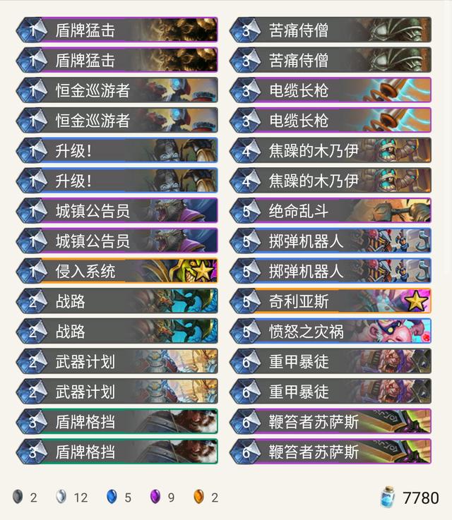 ike的一套任务战,说出来你可能不信这套任务战是来抓快攻和铺场萨的。构筑上满编战路、木乃伊、掷弹机器人、盾猛、战路和武器计划,乱斗与灾祸各带一张,一费随从带了四个,前期完全就是个一费挂任务的防战,坚不可摧,然后中后期挂鞭笞者、电缆长枪配合升级做任务,然后一回合差不多摇两个4/3重拳出击。那么你会问我为什么不玩防战?因为这是给有战士任务的小伙伴准备的哦!