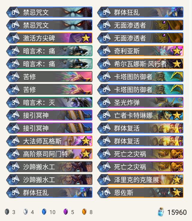 zetalot的一套任务控制牧。构筑亮点是加入了阿门特,因为我们五费曲线很饱满(无面渗透者、奇利亚斯和回血牛),前期又有禁忌咒纹、苦修和痛,四费裸下阿门特对面解不掉概率很大,就算解掉直接冥神复活收益也不错。其余构筑与控制牧基本类似,只是没带哈卡,换成了节奏型的女王。