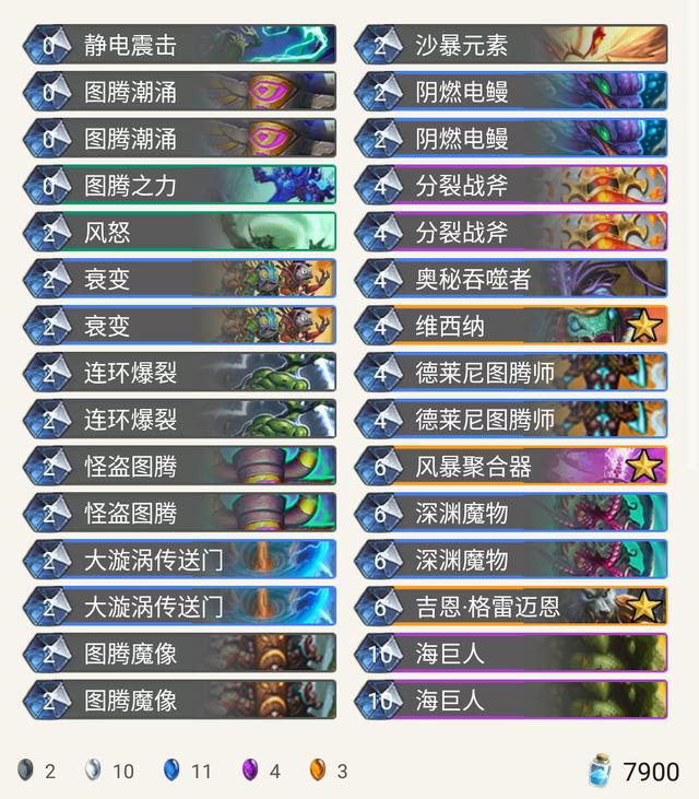 狂野模式的一套图腾偶数萨,过载体系之外的另一种思路。满编分裂战斧、图腾潮涌、怪盗图腾,前期照常摇图腾、上图腾魔像、电鳗,四费分裂战斧一波铺场,还能给深渊魔物永久减费,给海巨人减费,当回合就能贴图腾潮涌加攻,对面解不掉下回合维西纳甚至能直接斩,风暴聚合器也是针对我们的高效铺场准备的。