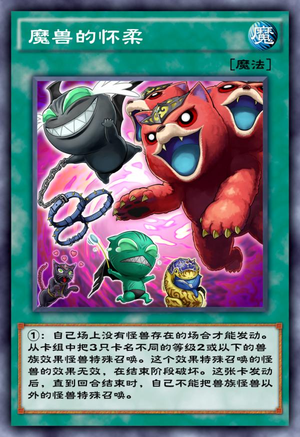 除了这些卡之外,我觉得最成功且最具价值的当属魔兽的怀柔这张卡,这张卡本身是魔轰神本家魔法卡,因为只有兽族二星或以下的限制所以灵活度非常高,在实卡环境中可是相当有价值的卡牌,配合童话动物一回合拉三只叠超量进行展开真的再适合不过了!而在决斗链接国服中这张卡同样可以在早期环境中发挥威力,无论是化合兽堆墓起效还是迅捷鼯鼠的阴间展开都能打出非常有意思的combo。后续随着兽族同调怪兽的出现,这张卡必然会成为兽族一卡同调的关键哦!