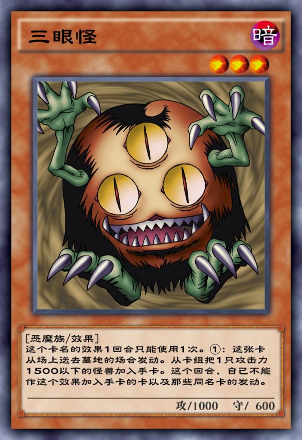 三眼怪同样是从初代火到今天的神卡,这张卡虽然有卡名一回合一次的限制,不过只要送墓就能起效检索的设定让这张卡适配度变得非常广泛,稳定检索攻击力1500以下的怪兽还是相当舒服的。在实卡对战中,这张卡曾经是与导游绑定的展开核心,尤其是在自奏流行的时代,导游一卡展开的玩法中三眼怪就是非常核心的展开跳板。而在游戏王决斗链接国服中,这张卡主要作为卡组中的核心检索卡来使用,从场上送墓就能起效可以适配非常多的构筑,而且在当前国服的同调环境中也能为同调卡组赚到相当不错的资源。
