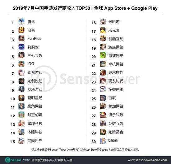 近日,移动应用数据分析公司Sensor Tower发布了2019年7月中国手游发行商收入排行,其数据采集自苹果APP Store以及Google Play。