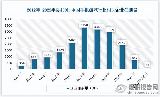 我国手游行业国内竞争来看,数据显示,我国手机游戏行业相关企业注册量于2012-2017年呈增长趋势,可见2012年到2017年国内手游行业内相关企业竞争是逐渐激烈,这也主要是由于这一期间我国手游行业用户规模快速增长,市场规模也较快速度增长,因此越来越多的企业涌入市场;2017年后行业相关企业注册量逐渐下降,到2021年企业注册量为847家,较前年下降1305家,国内手游行业竞争格局也逐渐定型,且处在第一、第二阶梯的企业市场份额逐渐扩大,蚕食第三阶梯企业市场份额,在2022年上半年行业内新增企业注册量更是下降至31家。