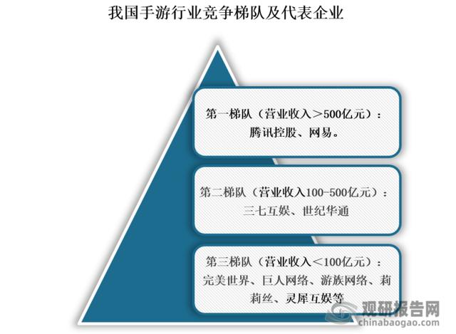 从市场竞争格局来看,我国手游行业依据游戏相关业务营业收入进行划分,可分为三个竞争梯队。其中,处在第一梯队的企业是游戏相关业务营业收入超过500亿企业,主要是腾讯控股和网易;处在第二梯队的企业是 游戏相关业务营业收入在100-500亿元的公司,有三七互娱和世纪华通;处在第三梯队的企业是游戏相关业务小于100亿的公司包括完美世界、游族网络、吉比特、巨人网络、掌趣科技、英雄互娱等。