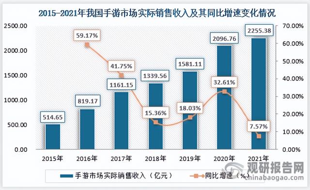 在我国智能手机蓬勃发展,移动互联网兴起以及手游用户规模稳步增长驱动下,我国手游行业市场开始崛起。市场规模来看,从2015年到2021年我国手游市场实际销售收入从514亿元增长至2255.38亿元。在这期间,2016年我国手游市场实际销售收入同比增长高达59.17%,此后手游市场实际销售收入增速随着手游用户规模增长速度变缓而变缓;在2020年受疫情期间宅经济影响我国手游市场则迈过2000亿元大关,手游市场实际销售收入同比增速达到约32.61%;2021年疫情宅经济红利逐渐消退、游戏版号暂缓发行等多方因素影响,手游市场实际销售收入同比增速快速下降至7.57%。