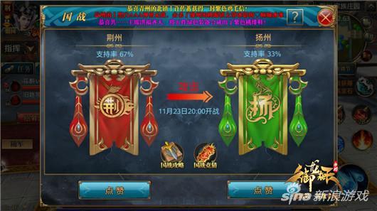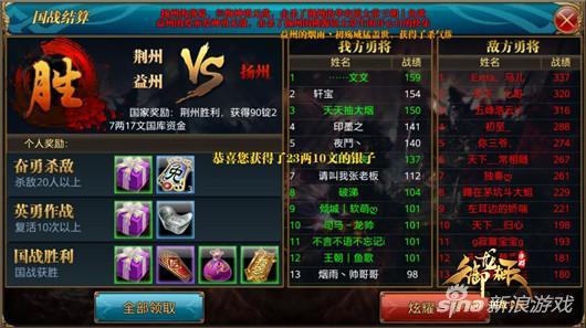 20点28分,在国战时间即将耗尽的时候,顽强的荆州、益州国民顶住了扬州的压力,打爆了中央神兽取得了对扬州国战的胜利。在此恭喜荆州、益州获得胜利,同时为扬州以一打二丝毫不落下风的优秀的作战素养点赞。