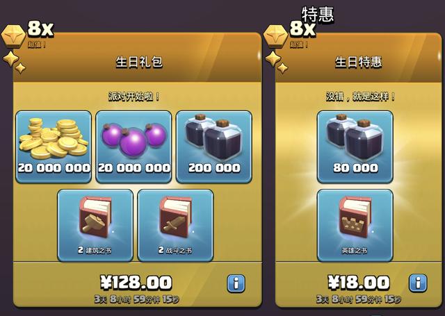 与此同时,在这几天内,还可以享受商店8周年生日特惠, 8倍超值!就这一点来说真的是相当划算的,2000万的金币和圣水,还有20万的暗黑重油,配上这个超级实惠的价格,是不是爱上这个神仙八周年了?