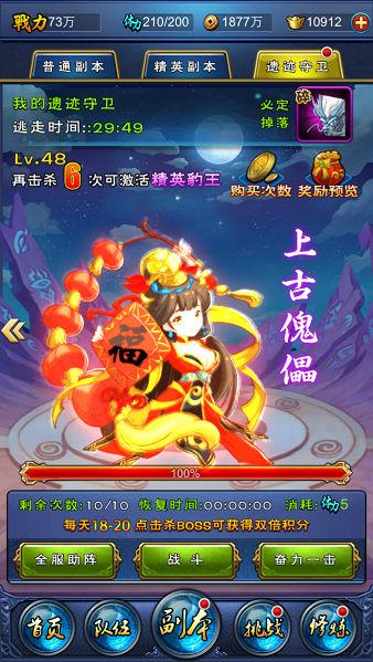 《新大主宰》猴年贺岁版推出贺岁专属玩法“猴年遗迹”,活动期间遗迹守卫BOSS会随机掉落【春】【节】【快】【乐】四个汉字道具,集齐一句【春节快乐】可以召唤新年特有神兽or法宝!其中上古傀儡更是化身软妹子至尊福娃形象,虽然外表可爱,实力可不容小觑!