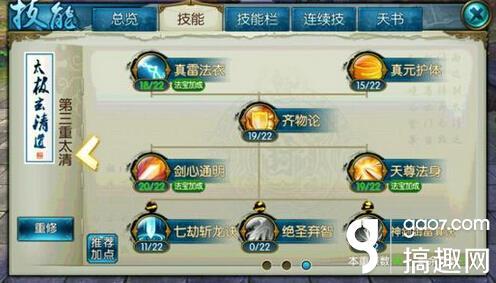 此技能技能加点大致遵循以下原则:有大点大(七劫/神剑),没大点有用的被动(伤害暴伤暴击定精暴抗),在之后主要输出技能(真元华闪,法衣),然后次要输出技能(御剑、破魔、换雷),之后再去考虑目前来讲没大用的抗性和真气。