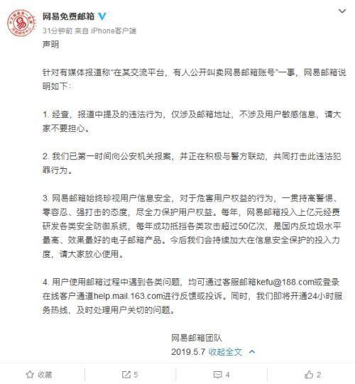 针对有媒体报道称“在某交流平台,有人公开叫卖网易邮箱账号”一事,网易邮箱说明如下: