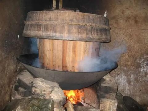 2、上甑,铁锅中要放少许的水,别让锅少干了,因为是靠下面的水蒸气来煮熟甑中的大米的。这个就开始是大火,烧开为止。这个时候,锅中的水干了一些部分,就可以再需加一些水,始终保持锅中有水。持续要1个多小时,根据米的大小多少来考核,烧水甑的时间。要等到外面能闻到香喷喷的问道了。
