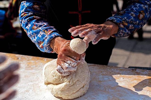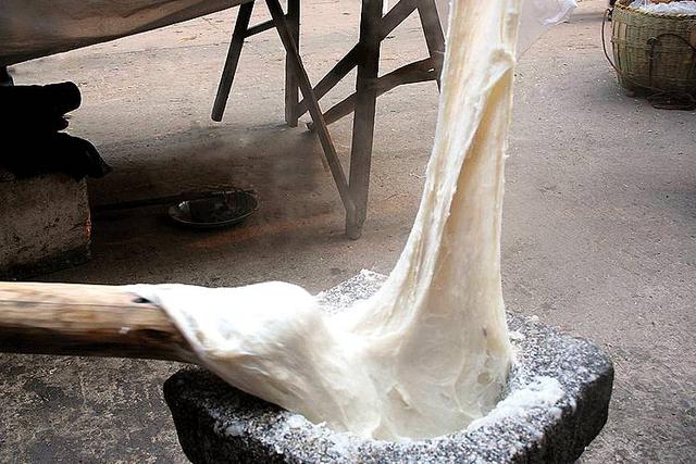 7、这个细节展示的非常好,这就是来看看,糯米的细化程度如何,看是否还要加工,要是还没有碎,那么就是继续加工,打几下,这样才能变成人们想要的细腻程度,就可以出锅了。每个地方叫法都不一样,我们叫”出款“了。