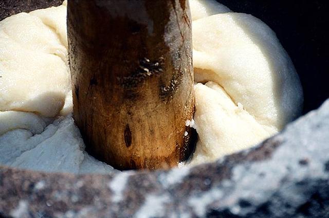 4、把糯米倒入打“把款”中,开始进入下一轮的对打中,因为糯米只有通过搅拌一样的工序,只是这不是搅拌的办法,就是用最原始,最生态的人工来对打,下图也有示意图,用来翻转,反反复复只要要二十个来回,见到糯米粒全部都细化了,才可以出:把款,放到案板中去进行下一个环节,就是成品的制作过程。这个环节是打糍粑的最关键的时刻,只有这个关键的时刻做好了,后面的工序,到后面的品尝起来,才有好口感。