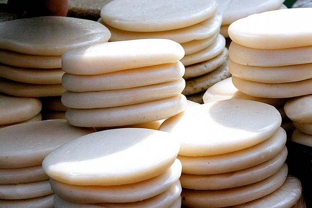 9:成品暂时,通过人们用手来压平压圆,这里面还要放一些石膏粉,放在上面,因为糯米很黏稠,需要石膏粉来减少这个粘稠。人们劳动生产中真能想办法。这就是基本的成品了。美味的糍粑就算是做成了。