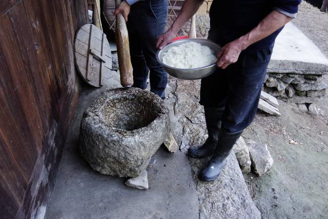 6、打糍粑的细节动作,经过用力打了之后,就把糯米变化成了糍粑的最基本的原材料。这个变化不是化学变化,只是物理变化。从糯米到糍粑,这就是生产工具的进步,才形成了糍粑。以前过年拜年走亲戚,也送一些糍粑过去,还有腊肉一些特产。现在都是满满的回忆。