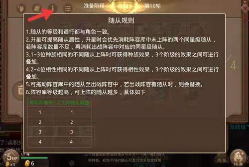 随从等级和道行与人物角色一致,道行按月道计算。刚开局时只可以上阵1个随从,战斗后会获得积分,使用积分扩展阵容库后可增加上阵随从数量,最多可以同时携带4名随从。