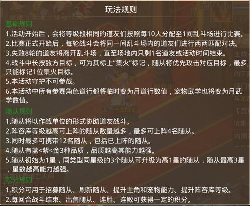 大乱斗玩法规则比较特别,简单来说就是每轮PK都是1V1,道友可以通过召唤随从、强化自身属性和扩展阵容库来提升战斗力。每轮PK两两随机匹配对决,失败8次直接淘汰,直到剩下最后一个人比赛结束,或者比赛时间结束。中途也可以自己退出,但没奖励。